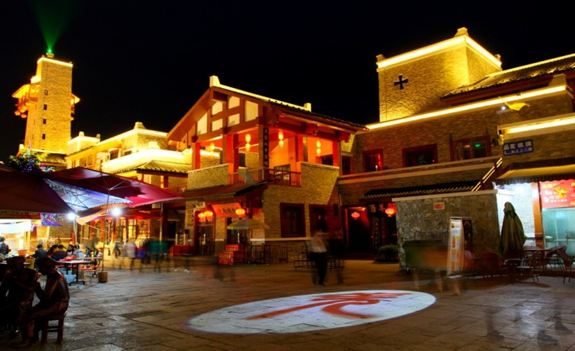 街區(qū)建筑物在房檐上設置RGB廣角小射燈,墻體中部配裝壁燈,頂部為LED洗墻燈,完整的勾勒出建筑物整體輪廓。建筑物瓦面的處理,僅采用硬條燈打亮屋脊的造型,壓低屋面整體亮度,明暗對比形成內斂的神秘感。小投影燈在地面上投出羌族文化特色的圖案,小巧而精致,別有一番趣味
