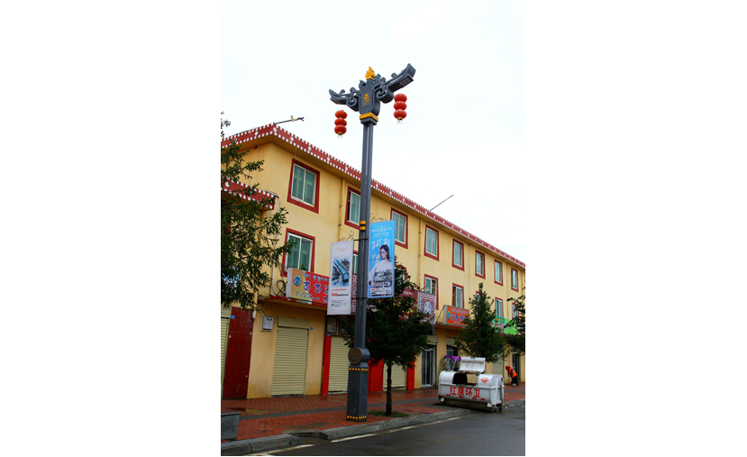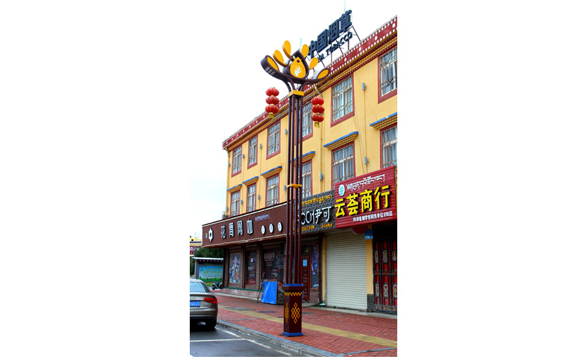 安裝在S209線的“犇?!睙粢愿呱礁吆貐^(qū)特有的珍稀牦牛為設(shè)計元素,牦牛被藏族人民稱為“高原之舟”。設(shè)計者通過燈型主體將牛頭牛角外部輪廓展現(xiàn)出來,塑造了一個栩栩如生、富有力量感和氣勢磅礴的犇牛形象。燈桿中部燈箱絲印臧八寶圖案,內(nèi)置LED光源,愿當(dāng)?shù)孛癖娂槌T?,眷屬和睦,所求如愿?