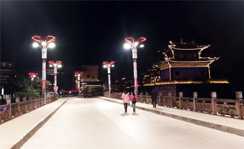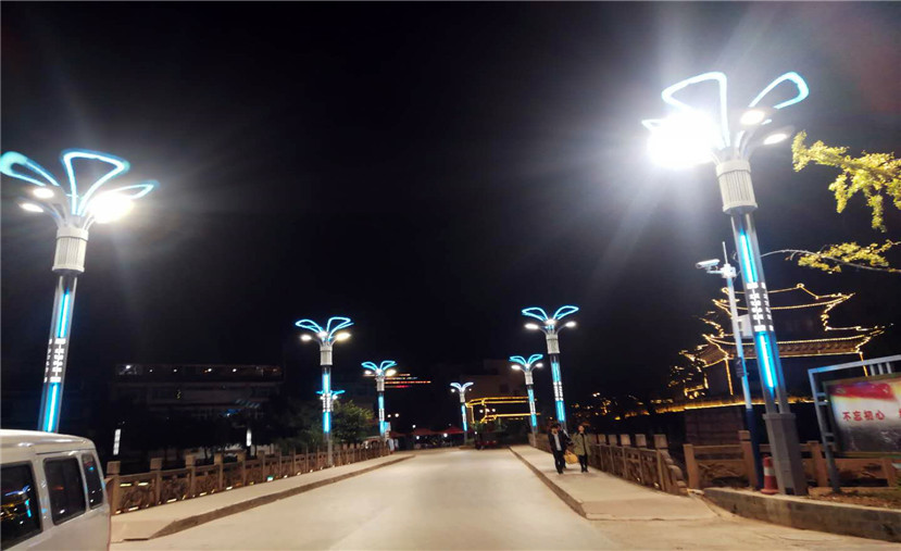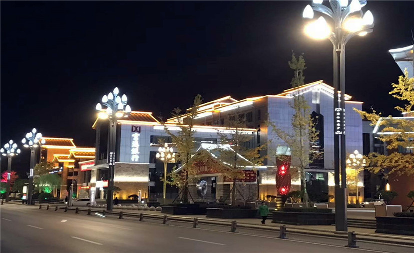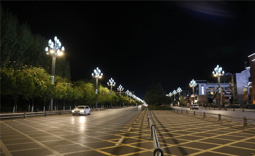 華體照明根據(jù)麗江市擁有眾多少數(shù)民族的特點,為其量身定制了八叉九火玉蘭燈500多套、雙頭庭院步道燈390多套和景觀燈柱50多套,分別布局在香格里拉大道的大道旁、人行道旁和大道中間的綠化帶區(qū)域。