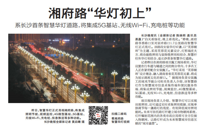 “芙蓉朝暉”智慧路燈建成亮燈后,得到了湖南當?shù)毓俜矫襟w的重點關注和報道。1月18日,長沙晚報在頭版重點報道湘府路上這條長沙市首條智慧路燈示范段。