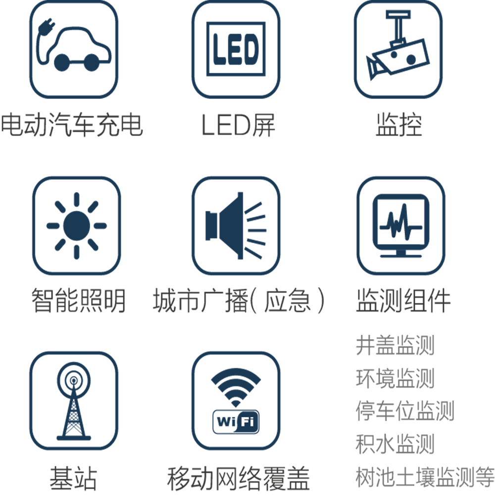 功能涵盖面了基站、摄像头、应急广播、环境监测、显示屏、充电桩等,能根据智慧城市建设的需求定制组件加载方案。